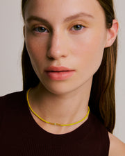 Our lemon beaded necklace is created using high quality glass beads and strong cotton cord. This zesty piece has a delicate strip of gold in the centre with a green accent bead, and has been hand-beaded by our team of skilled women beaders in Kwazulu-Natal, South Africa.
